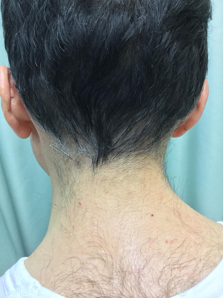 今日も恒例の免疫治療。1人1人スタッフの首に印をつけていく院長。