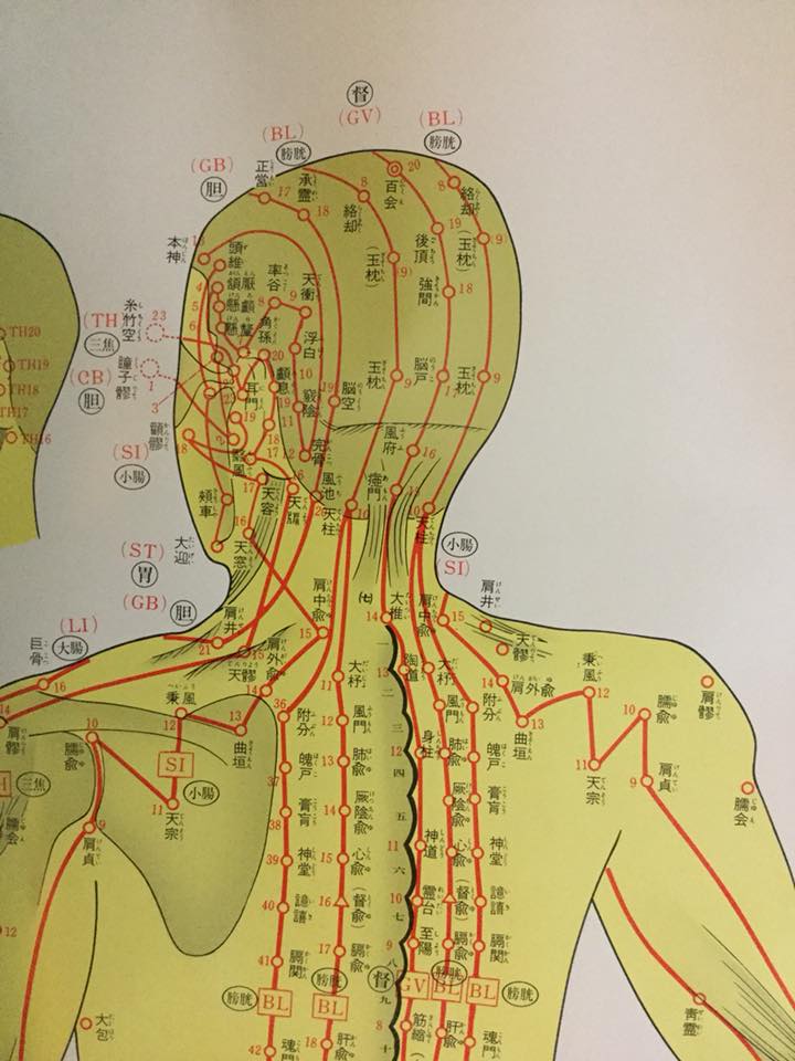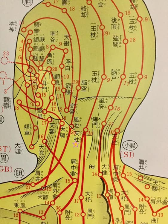 腰痛の治療が終わると今度は「いつも吐き気がしている」という症状に対しまたも頚椎。ポンポーンとポイントを取りここに鍼を打つように指示。