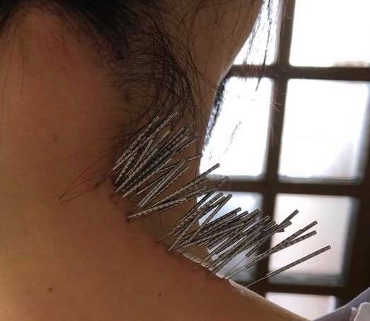 そんな患者さんになんと院長は、肩から首に向かってリズムよくトントントーンと鍼を刺していく。その数なんと、80本。